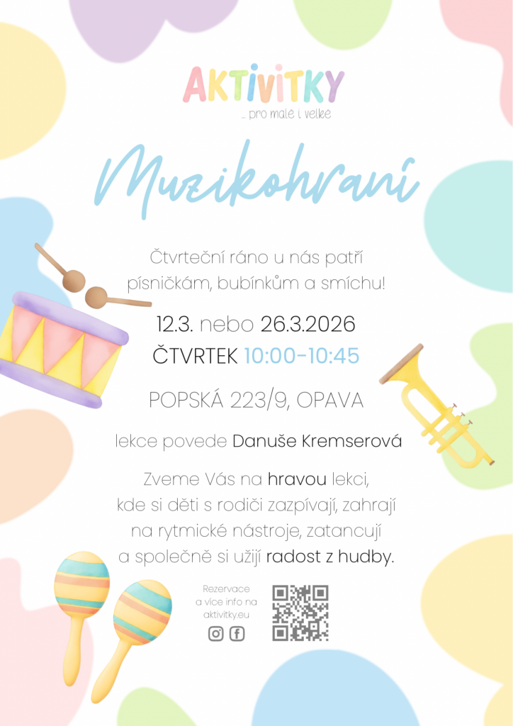 Čtvrteční ráno u nás patří písničkám, bubínkům a smíchu! Zveme Vás na hravou lekci, kde si děti s rodiči zazpívají, zahrají na rytmické nástroje, zatancují a společně si užijí radost z hudby. Každá lekce je plná pohybu a rytmu! Není potřeba žádné hudební umění, stačí chuť si spolu zazpívat.